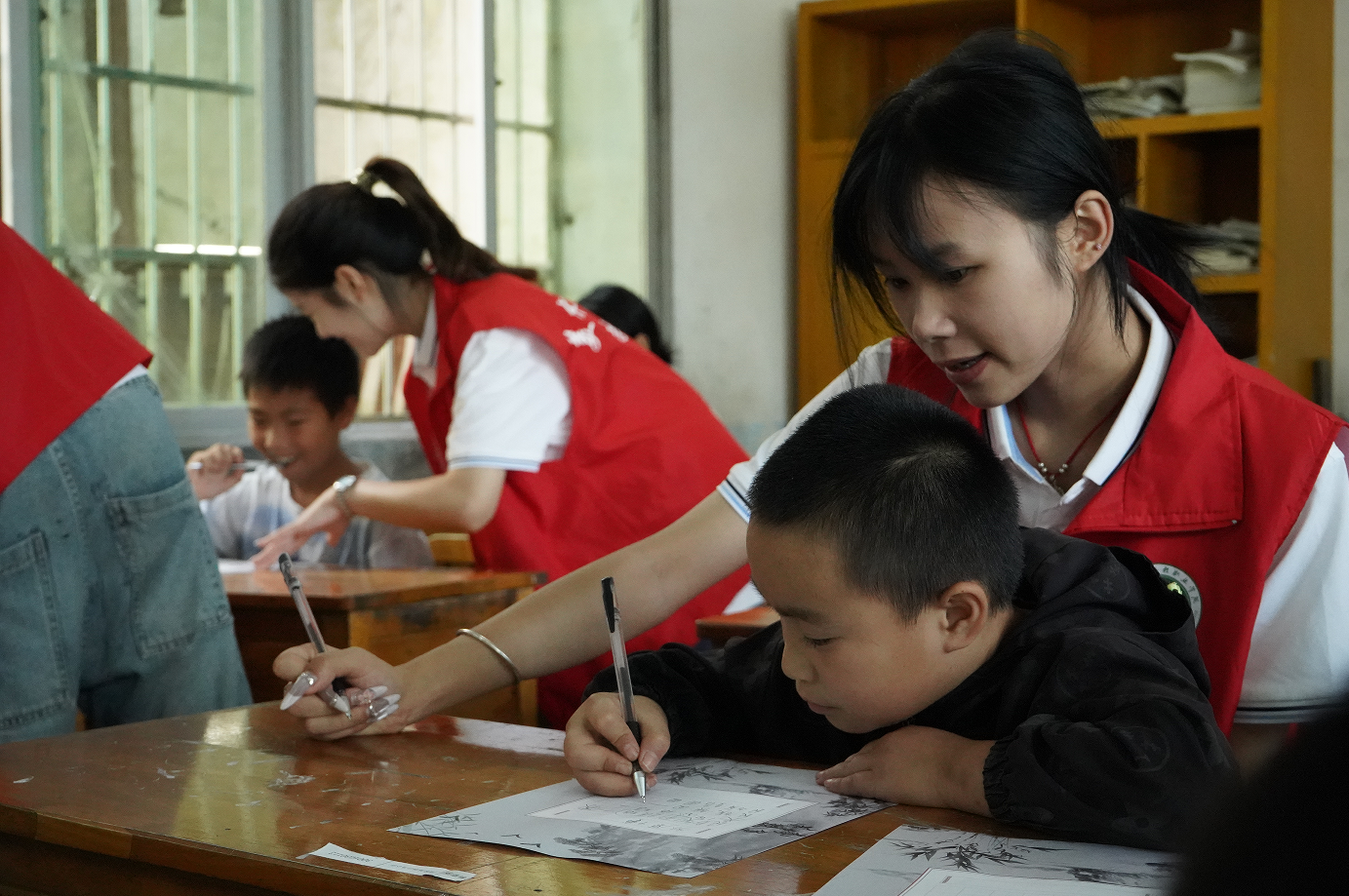 在拼音教学环节,志愿者带领孩子们认读声母、韵母,练习简单的拼音组合,带着同学们朗读《少年中国说》;防溺水安全课上,队员们通过生动的案例讲解和互动问答,教会他们如何避免溺水危险以及遇到紧急情况时的自救方法,增强了孩子们的安全意识;硬笔书法课上,志愿者从握笔姿势、基本笔画教起,耐心指导孩子们书写规范汉字,搭建起通往共同文化的桥梁;绘画课上,队员们鼓励孩子们展开想象,用五彩斑斓的画笔描绘自己心中的祖国的模样,写下对祖国真挚的祝福,在一笔一画的勾勒中厚植学生的爱国主义情怀,播撒下“民族团结”的种子,以实际行动诠释共青团员在民族工作中的责任与担当,用爱心与耐心浇灌民族团结青春之花。