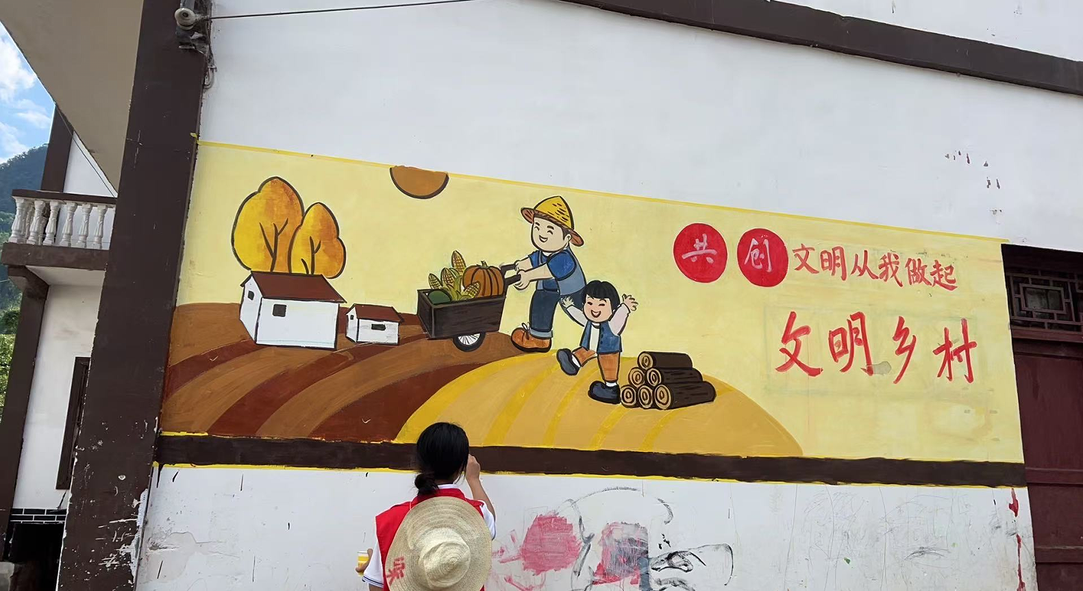 蝉鸣声声,烈日炙烤着青瓦白墙。志愿者们有序分工,默契配合,以灰白的墙面为天然画布,用粉笔勾勒轮廓,用颜料填色。2天的时间里,一幅色彩斑斓、创意十足的精美画作跃然于眼前:在深浅相间的黄色草坪上,一对父子推着装满农作物的车子满载而归,脸上洋溢着幸福的笑容——那是丰收的喜悦,也是在全面实施乡村振兴战略,全面建设社会主义现代化国家的新征程中,百姓安居乐业的真实写照。