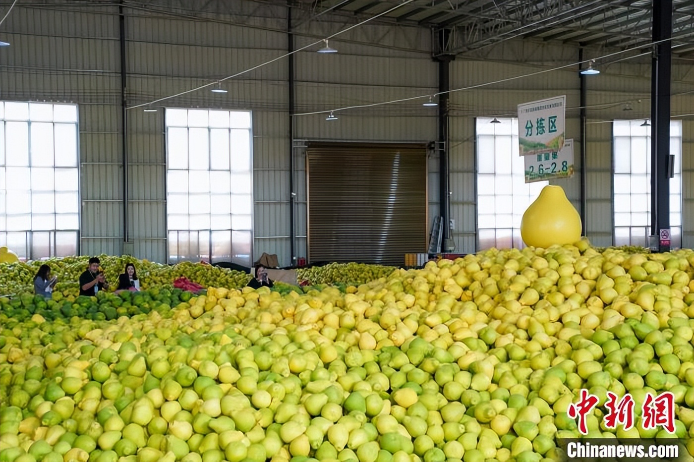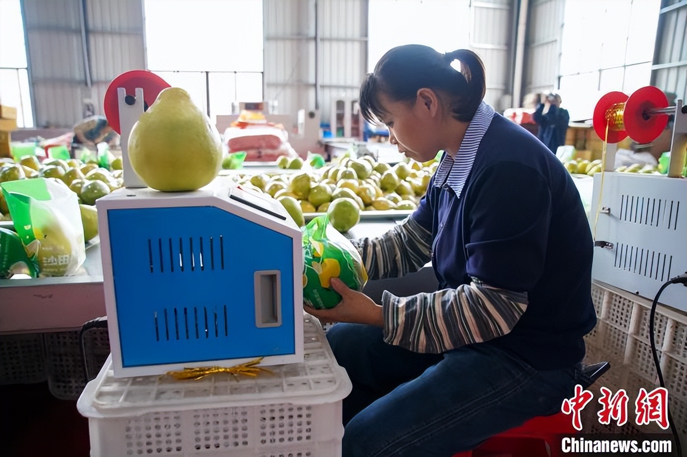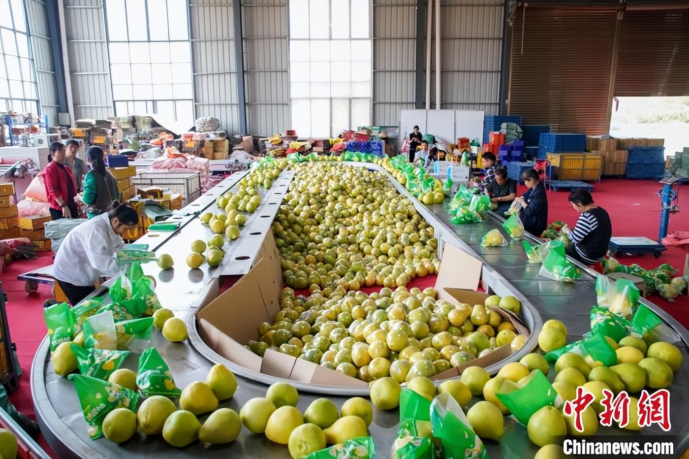 眼下,正是沙田柚丰收的时节。在广西容县一家企业的分拣中心,沙田柚鲜果经过清洗、分拣、包装等采后处理工作,将出库运往各大商超和消费者手中。