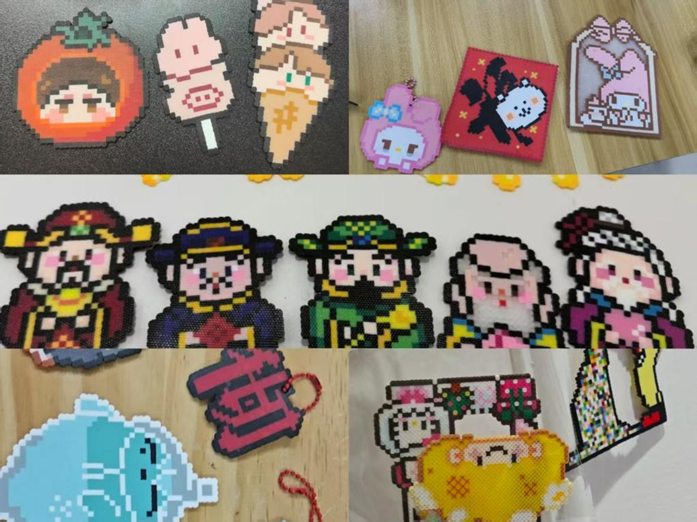 店内各色拼豆任你选择,镊子、豆盘、烫画机等工具一应俱全,百来粒豆子拼拼凑凑,呲啦一声熨烫过后,可爱的像素图案慢慢成型,这指尖的 “手作魔法”,让人一玩就上瘾。
