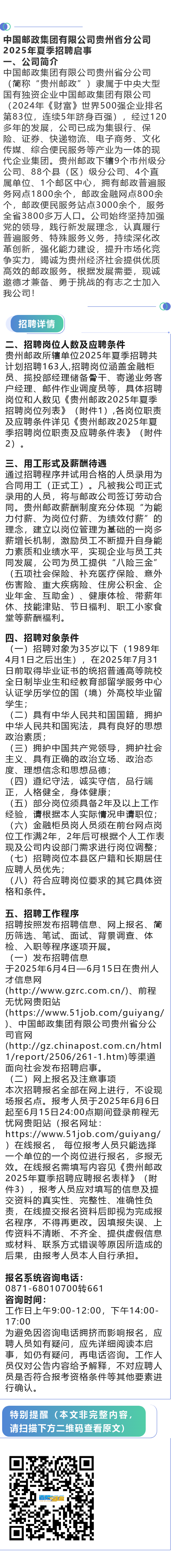 【中国邮政】中国邮政集团有限公司贵州省分公司招聘163人!八险三金+各类福利待遇!