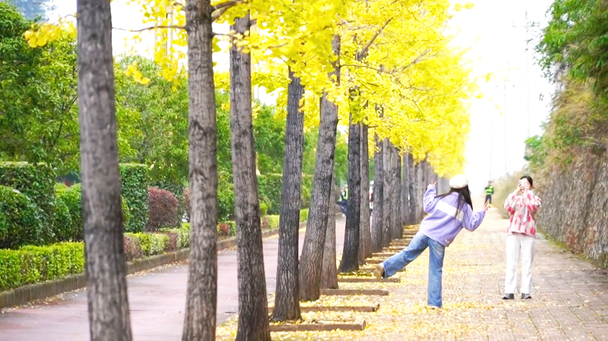 现场,摄影爱好者们用镜头捕捉古檐与黄叶交织的绝美画面;游客们或俯身挑选心仪的银杏叶留作纪念,或欢快地将落叶抛向空中,在纷飞的“金蝶”间嬉戏旋转。欢声笑语,为这幅静谧的秋景注入一抹灵动的活力。