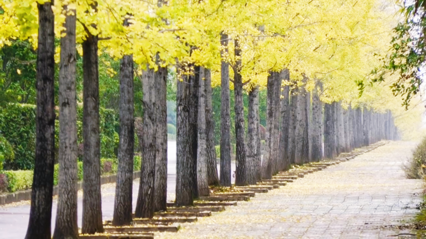 漫步在旧州古镇的银杏道上,两旁树木整齐排列,金黄的叶片如小巧折扇缀满枝头,微风拂过,摇曳生姿。地面落叶铺成一层厚厚的“金毯”,与枝头黄叶相映成趣。