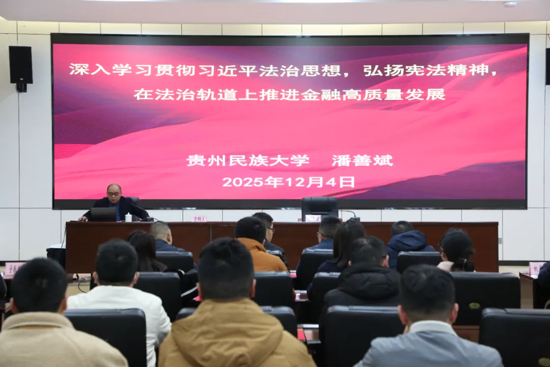 宪法宣誓活动前,省委金融办邀请到贵州民族大学法学院法学教授、博士生导师潘善斌开展了宪法专题讲座。通过深入浅出地讲解,让干部职工对宪法有了更加全面和深刻的理解,共同营造尊崇宪法、学习宪法、遵守宪法、维护宪法、运用宪法的良好氛围,更好发挥法治对金融改革发展稳定的引领、规范、保障作用。