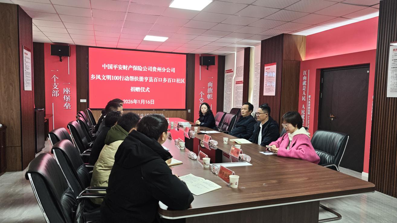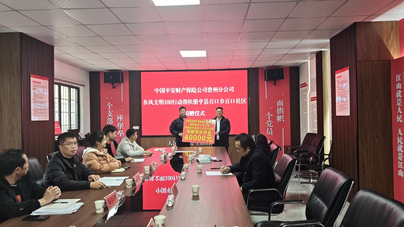 2026年1月16日,平安产险黔西南中心支公司联合贵州省红十字会在贵州省黔西南州册亨县百口乡百口安置区成功举行“乡风文明100行动”公益项目捐赠仪式。平安产险黔西南中心支公司向百口乡人民政府捐赠专项建设资金4万元,用于推进社区基层治理现代化建设,切实提升搬迁群众居住安全与生活品质。