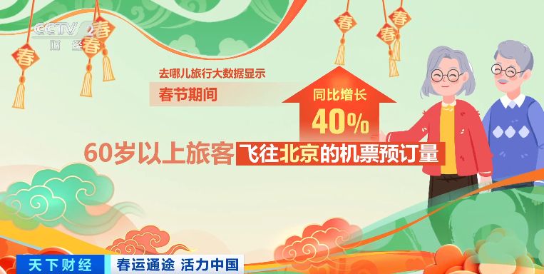 大数据显示,春节期间,60岁以上旅客预订机票量同比增长明显。其中,60岁以上旅客飞往北京的机票预订量同比增长40%,成都同比增长31%,天津同比增长30%,广州同比增长27%。