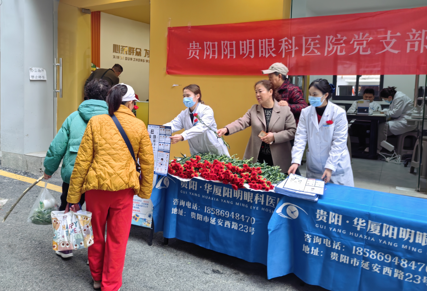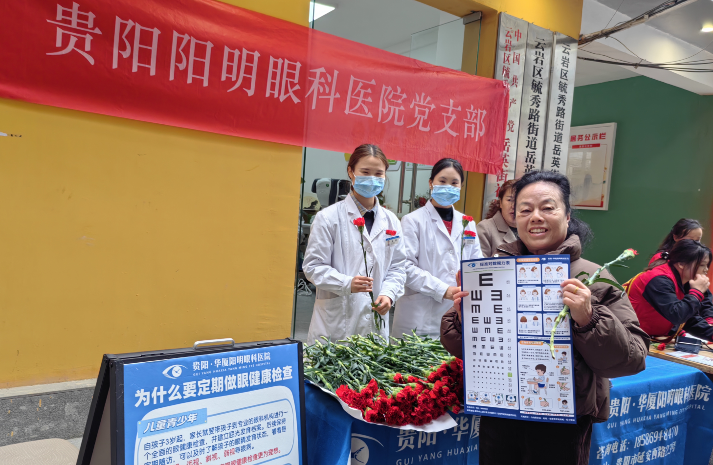 为弘扬雷锋精神,普及爱眼护眼知识,把专业医疗服务送到居民家门口,3 月 6 日下午,岳英街社区携手贵阳华厦阳明眼科医院开展 “明亮视界・健康同行” 公益义诊活动,为辖区居民送上眼健康关怀,同时向女性同胞致以“三八”国际妇女节的美好祝福,让暖心服务与芬芳花香萦绕社区。