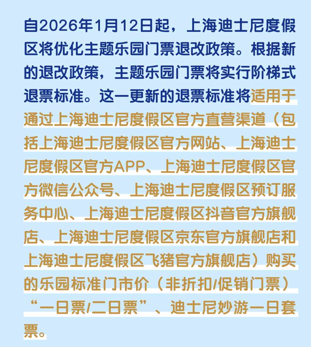 上海迪士尼度假区发布消息,将于2026年1月12日起优化主题乐园门票退改政策,实行阶梯式退票标准。