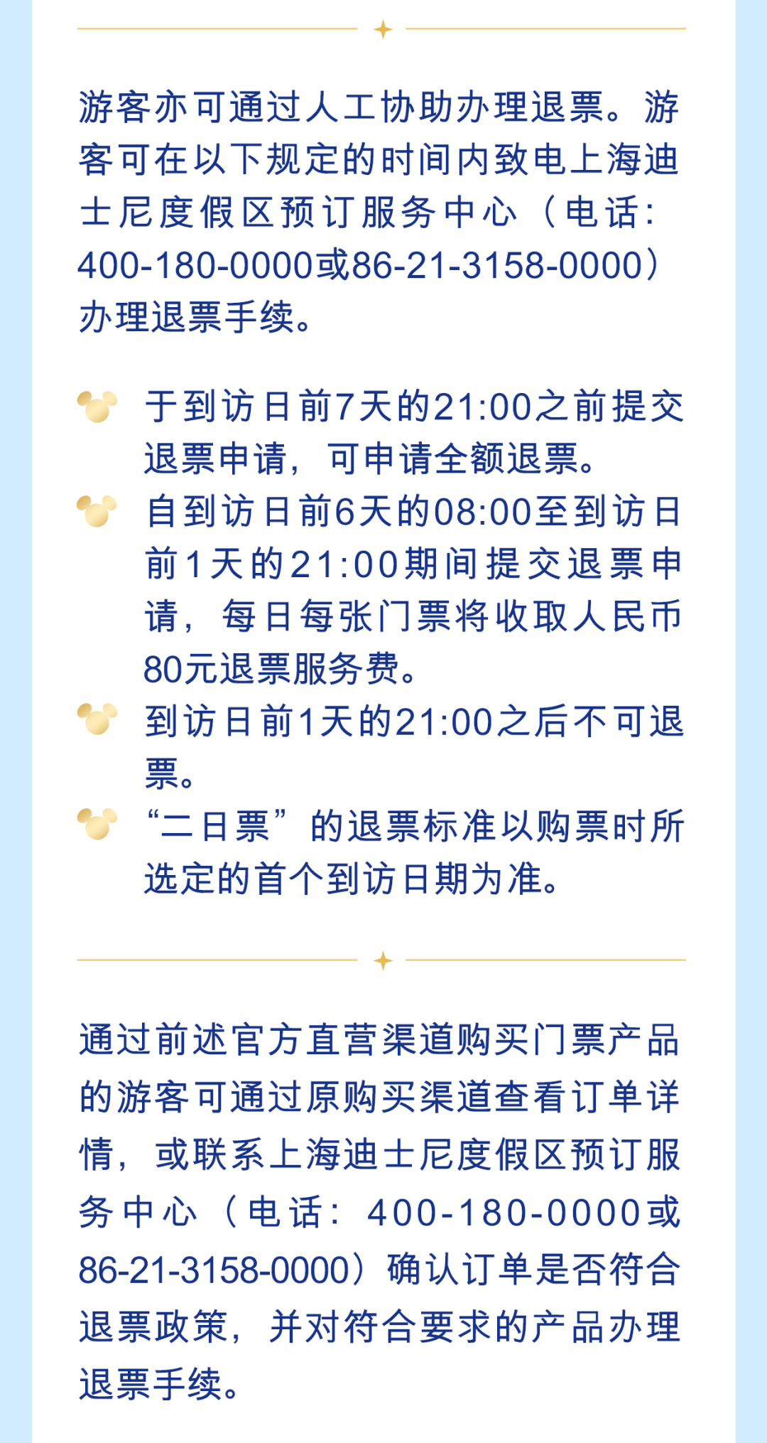 现行的上海迪士尼乐园门票退改政策规定,乐园门票不可转让、取消或退票。在同产品的其他适用日期尚有余票的情况下,游客可于原定入园日零点的48小时前,至多进行两次改期。