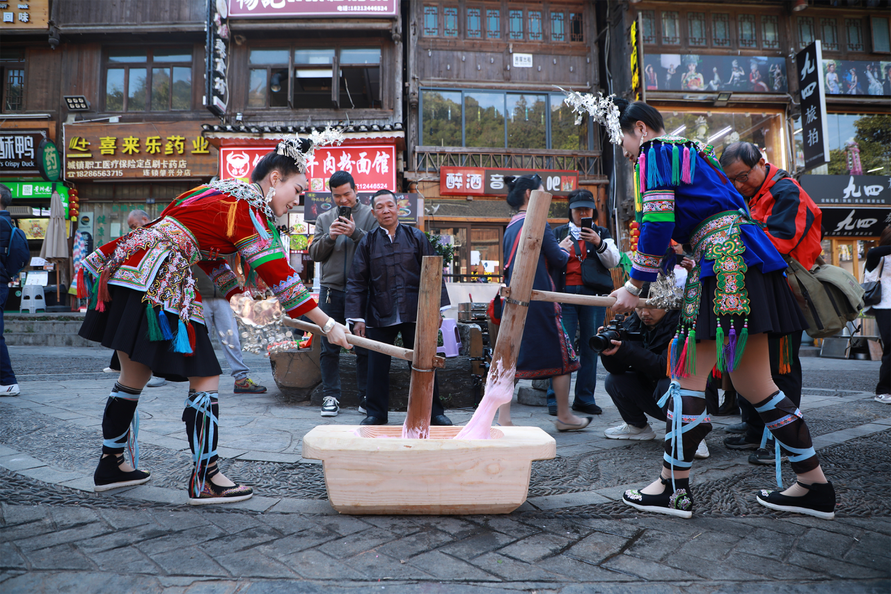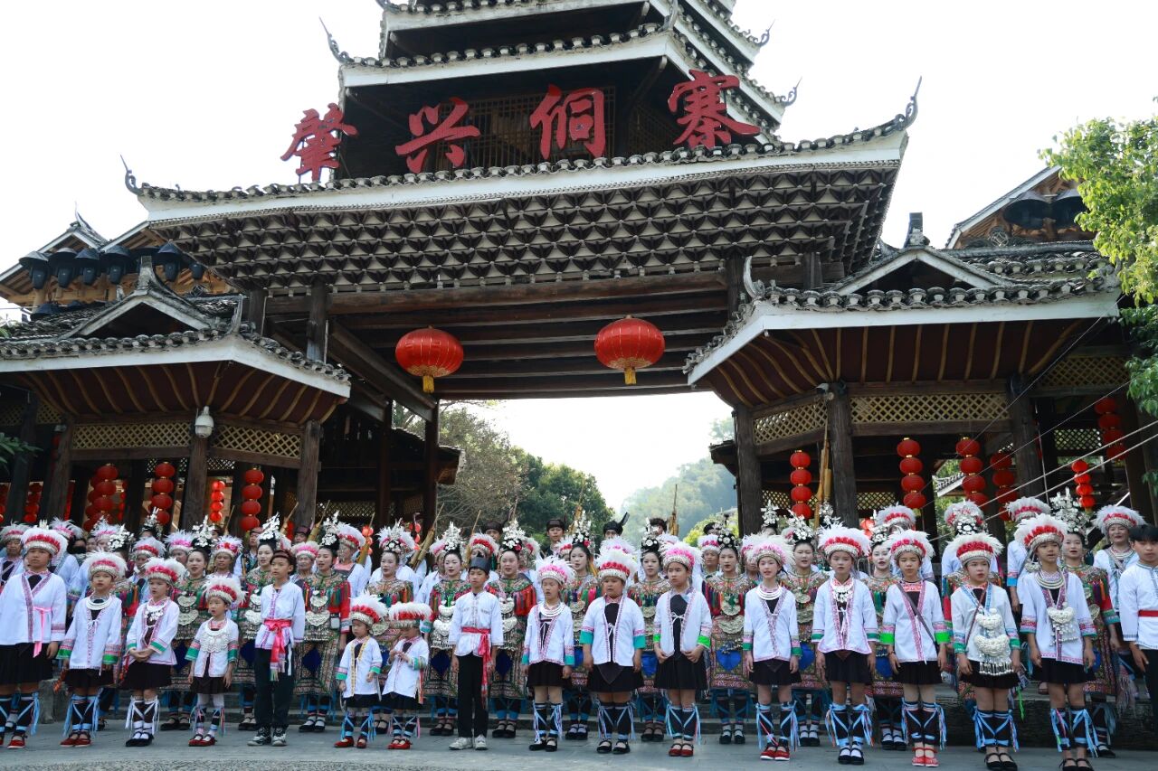 元旦清晨,踏着第一缕阳光,身穿盛装的侗家儿女为庆佳节、迎贵宾,在迎宾寨门前摆拦路酒、唱拦路歌。客人需对上首歌或饮杯美酒,方能通过这一道隆重的“礼仪之门”,进入寨中。