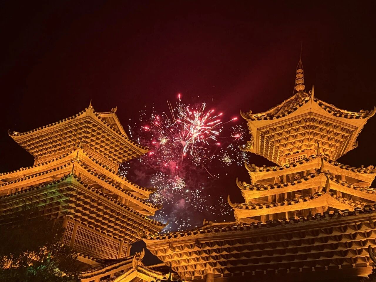零时将至,全寨灯光渐暗,唯有鼓楼巍然静立。随着倒计时的侗语呼喊划破夜空,第一束银花从鼓楼尖顶绽放霎时间,漫天金雨倾泻,流光掠过花桥廊檐,映亮梯田轮廓。烟花如百鸟展翼,在侗寨天幕上绘出流动的斑斓。人们仰首惊叹,孩童嬉笑追逐,愿烟火照山河,新年胜旧年。