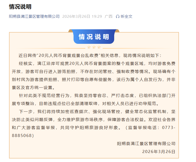 经核实,漓江沿岸可观赏20元人民币背景图案的整个观景区域,均对游客免费开放,游客可自行进入游览拍照,不存在封闭管控、强制收费等情况。现场确有个别村民为游客提供拍照、照片打印等自愿有偿服务,该行为属个人自发行为,并非景区及官方统一设置。