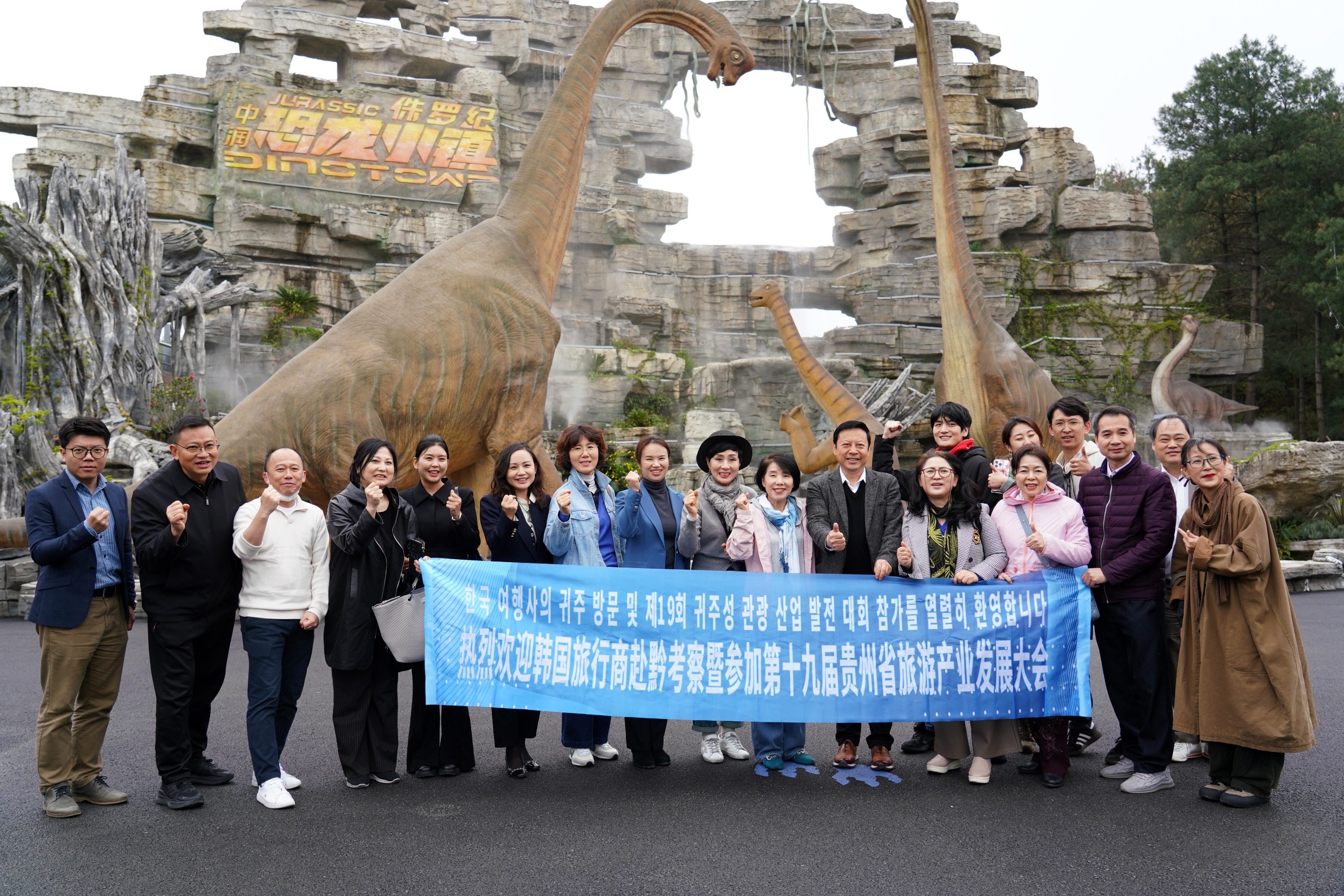 30分钟车程后,韩国客人来到了清镇侏罗纪恐龙文化科普特色小镇。这里是亲子家庭与探险爱好者的天堂,它以“贵州龙”化石为灵感,打造了集科普、研学、娱乐、休闲于一体的沉浸式乐园。