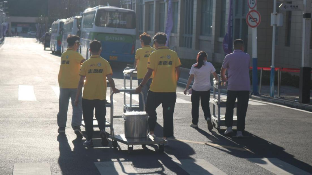 餐食保障组工作人员有序运送餐食,保障参赛人员与裁判的饮食需求