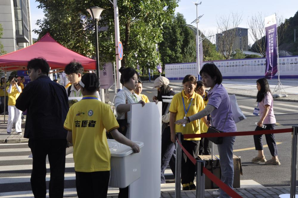 工作人员引导志愿者搬运赛事物资,保障赛场物资精准到位