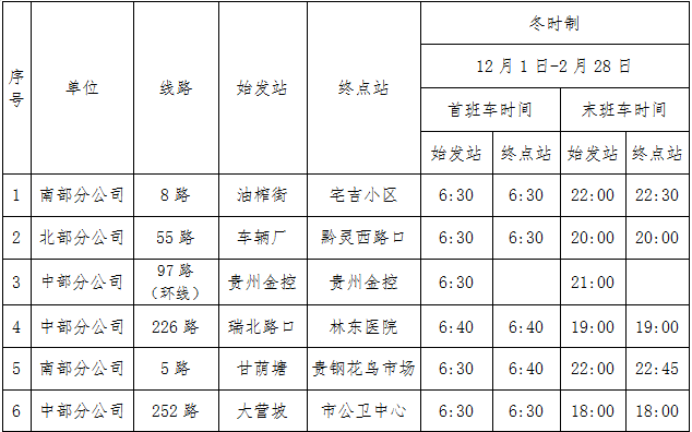 贵阳市公共交通有限公司冬季末班车时间调整表