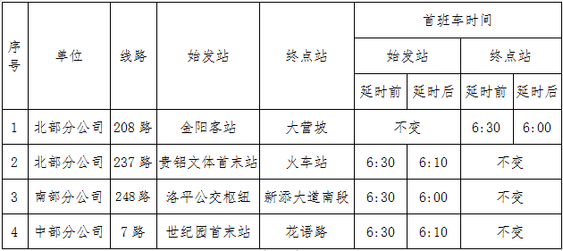 (一)为更好服务市民出行,对运营分公司191条运营线路进行梳理,结合客流特征,分批进行调整,第一批调整4条线路的首班车时间,分别为:7路、208路、237路、248路。后续将结合实际情况逐步推进其他线路优化。