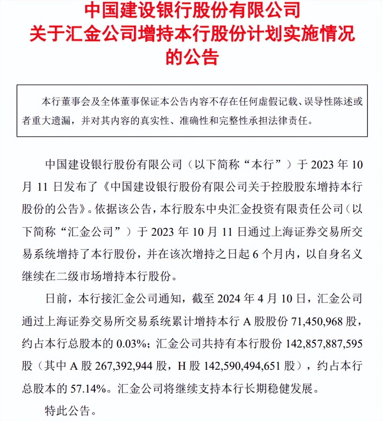 建设银行公告称,截至2024年4月10日,汇金公司通过上海证券交易所交易系统累计增持建设银行A股股份71,450,968股,约占建设银行总股本的0.03%;汇金公司共持有建设银行股份142,857,887,595股(其中A股267,392,944股,H 股142,590,494,651股),约占建设银行总股本的57.14%。