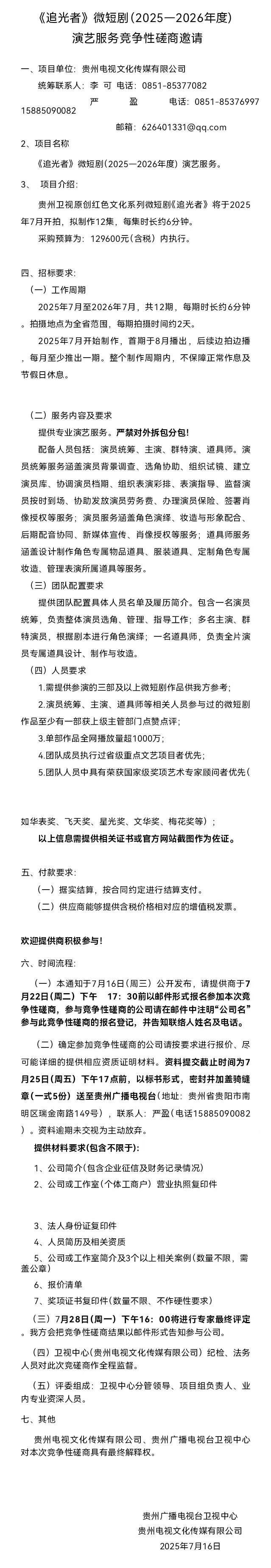 《追光者》微短剧(2025—2026年度) 演艺服务竞争性磋商邀请