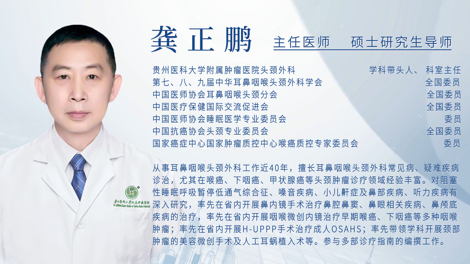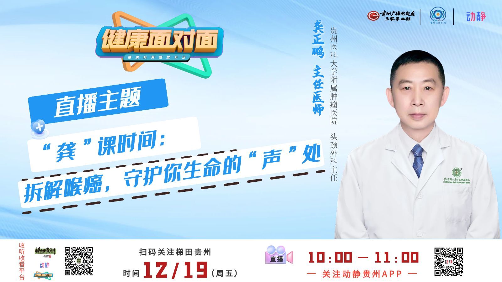 12月19日,贵州经济广播《健康面对面》栏目将邀请贵州医科大学附属肿瘤医院头颈外科学科带头人,国家癌症中心国家肿瘤质控中心喉癌质控专家委员会委员,龚正鹏医生,做客直播间为大家讲解“喉癌”的预防与治疗。他深耕耳鼻咽喉头颈外科近40年,是领域内公认的领军人。从早期喉癌的微创手术,到复杂的头颈肿瘤综合治疗,他带领团队在贵州开创了多个“率先”。