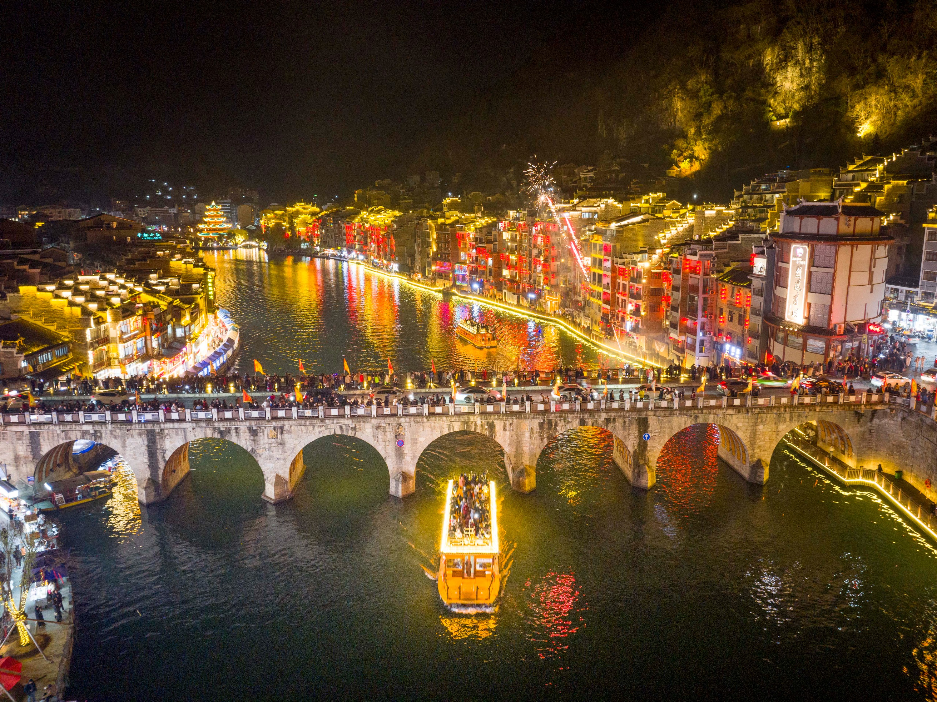夜幕降临,镇远古城以其独特的夜景不断吸引游客和摄影爱好者前来探访。青龙洞古建筑群、祝圣桥、石屏山等标志性景点在夜色中展现出与白天截然不同的风貌,千年古城在灯火的映衬下焕发出新的生机与活力,向世人展示着其独特的魅力和文化底蕴。
