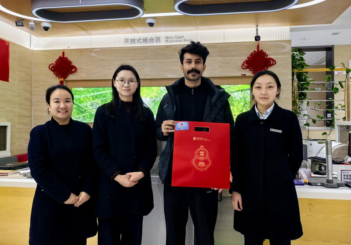 中行铜仁分行工作人员为ASAD ALI先生发放社保卡和送上新年礼物