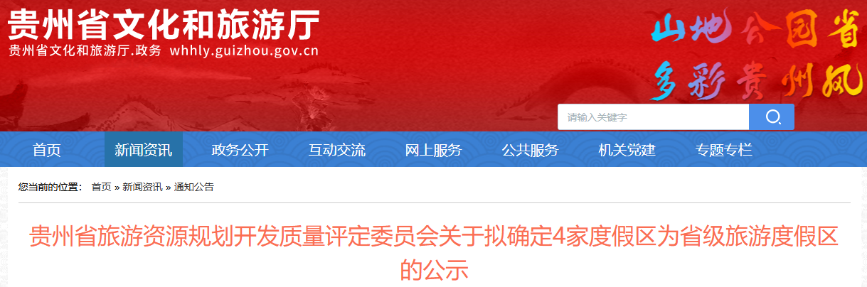 根据中华人民共和国国家标准《旅游度假区等级划分》和《贵州省旅游度假区管理办法》,经有关市(州)文化和旅游行政部门推荐,贵州省旅游资源规划开发质量评定委员会按程序组织综合评定和会议审定,以下4家度假区达到省级旅游度假区标准要求,拟确定为省级旅游度假区,现予以公示。名单如下: