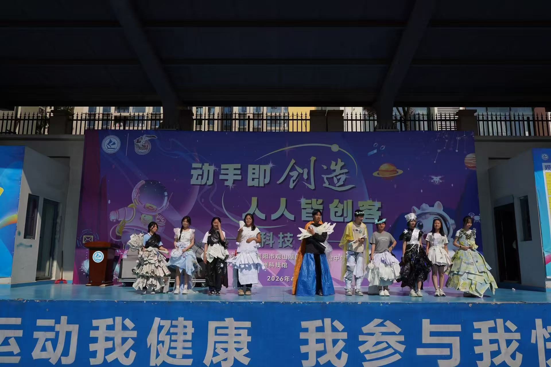 4月10日,贵阳市观山湖区外国语实验中学2026年科技节在南、北两个校区运动场同步拉开帷幕。本次活动由观山湖区教育局、观山湖区科技局、观山湖区科学技术协会联合主办。以“动手即创造 人人皆创客”为主题,旨在通过实践体验与动手创造,激发学生创新意识、培养科学素养,打造特色校园文化。