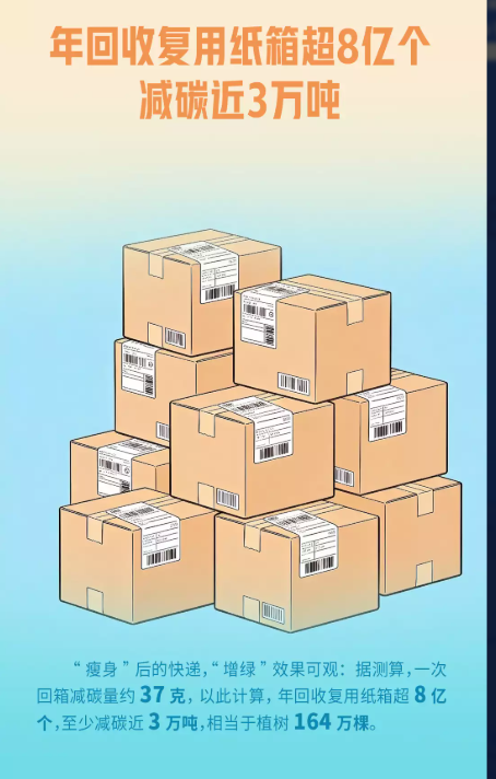 “瘦身”后的快递,“增绿”效果可观:据测算,一次回箱减碳量约37克,以此计算,年回收复用纸箱超8亿个,至少减碳近3万吨,相当于植树164万棵。