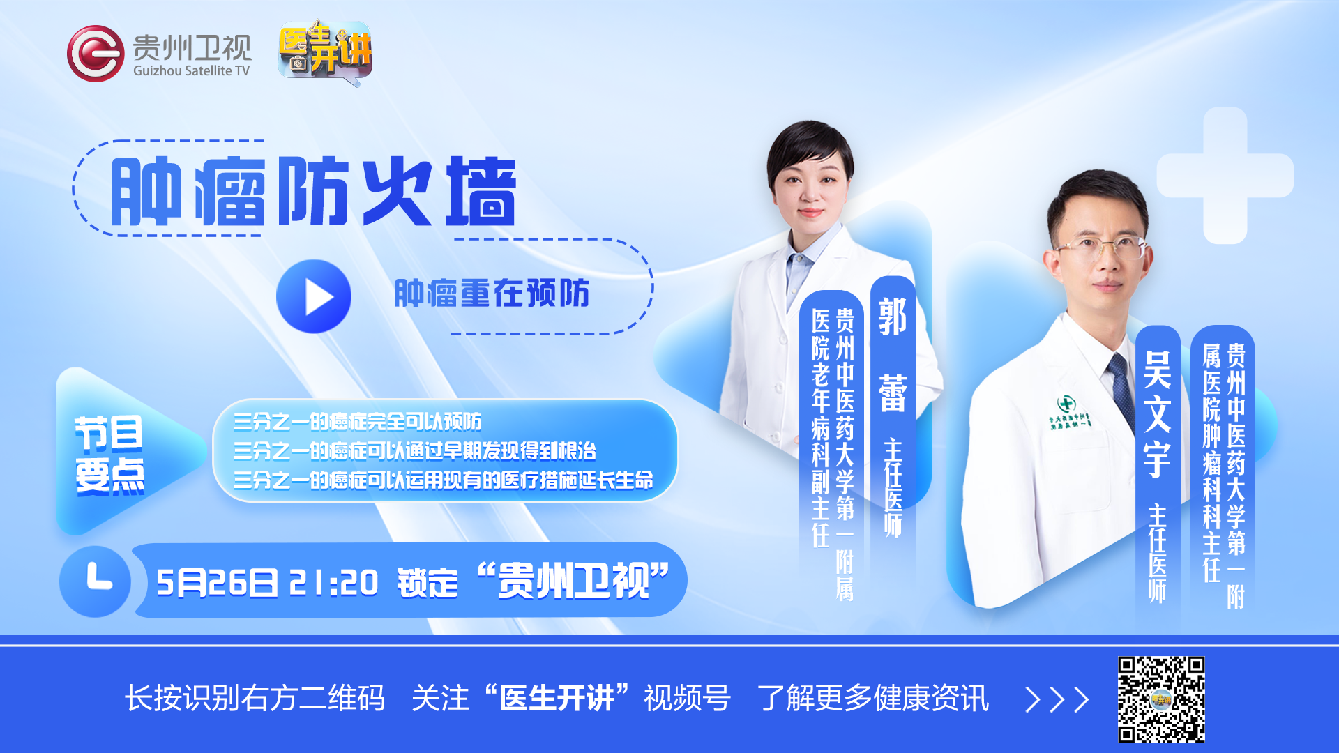 5月26日21:20,《医生开讲》特邀贵州中医药大学第一附属医院的吴文宇教授和郭蕾教授,他们将现场解读癌症的“前世今生”,分享饮食防癌秘籍、运动防癌妙招,还有情志管理的中医智慧。锁定5月26日21:20《医生开讲》,让我们一起跟随专家的脚步,开启防癌之旅,守护健康,拥抱美好生活!别忘了准时收看,精彩不容错过!