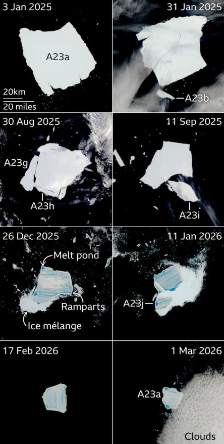2026年4月初,A23a的面积已缩减至35.2平方公里,不再满足冰山编号条件,被正式“销号”。