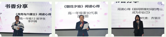 书香分享环节,三位代表娓娓道来——高一(13)班李开腾同学从《月亮与六便士》中探寻理想与现实的距离;高一(1)班家长邵琼丽女士以《朝花夕拾》为引,讲述亲子共读的温暖时光;齐慧欣老师以《翻越那座时间的青山,成为你自己》为题,分享教育者以书育人的坚守。