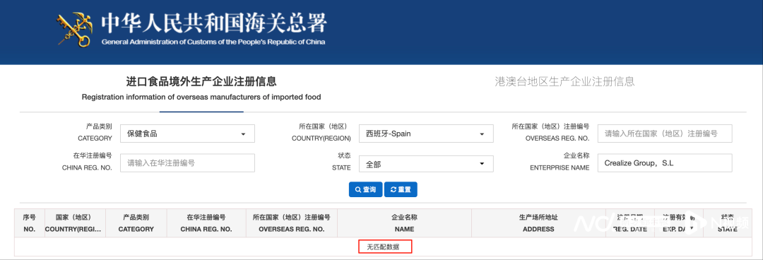 南都N视频记者通过海关总署相关查询渠道核查确认,概念180标称的境外生产主体西班牙 Crealize 公司未在海关总署进口食品境外生产企业注册名单内。