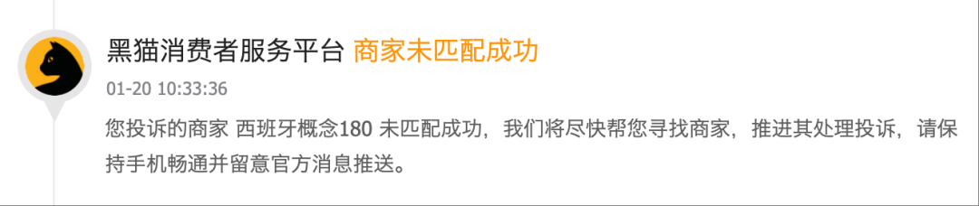 更令消费者维权受阻的是“身份匹配难题”。曹女士在黑猫投诉平台提交投诉后,收到的系统反馈显示:“您投诉的商家‘西班牙概念 180’未匹配成功,我们将尽快帮您寻找商家,推进其处理投诉。” 这一情况导致消费者维权陷入“找不到责任主体、无法精准维权”的困境。