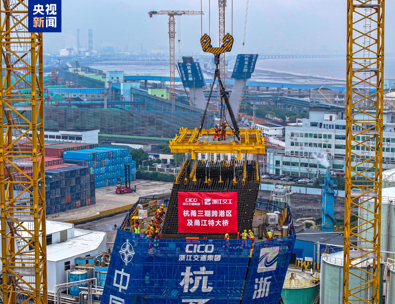 11月11日上午,杭甬复线宁波三期项目甬江特大桥施工现场,一节重达67吨的钢筋部品被稳稳吊起,并精准安装到主塔预定位置,标志着这一世界级跨江大桥全面进入部品化施工阶段。