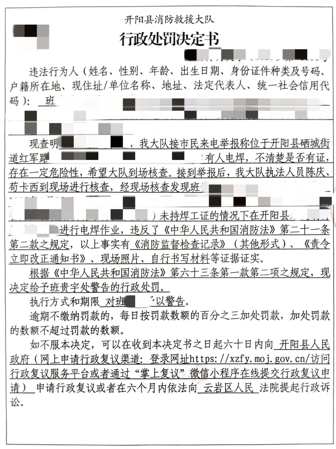 近日,贵阳市消防救援支队开阳大队接到群众举报,反映开阳县硒城街道红军路有人存在违规电焊作业行为,防火监督员立即前往现场核查。经现场核实,开阳县永发钢材经营部电焊工班某某,在不具备特种作业操作证的情况下,擅自进行电焊明火作业,群众举报情况属实。
