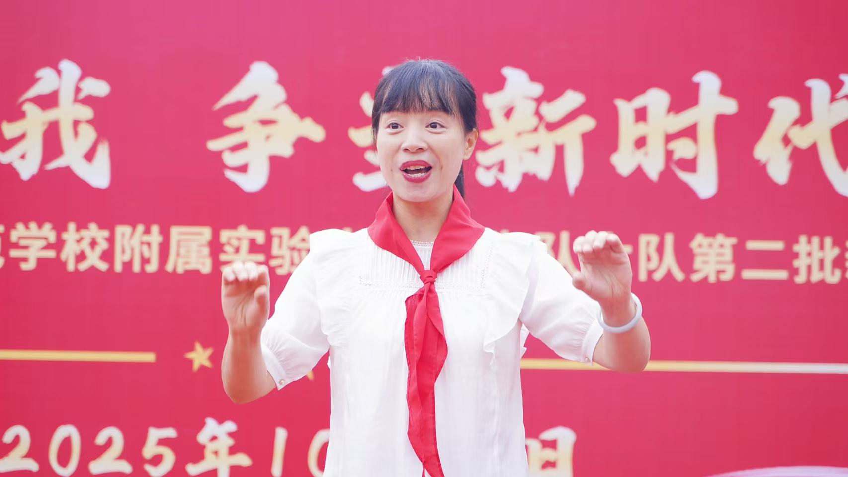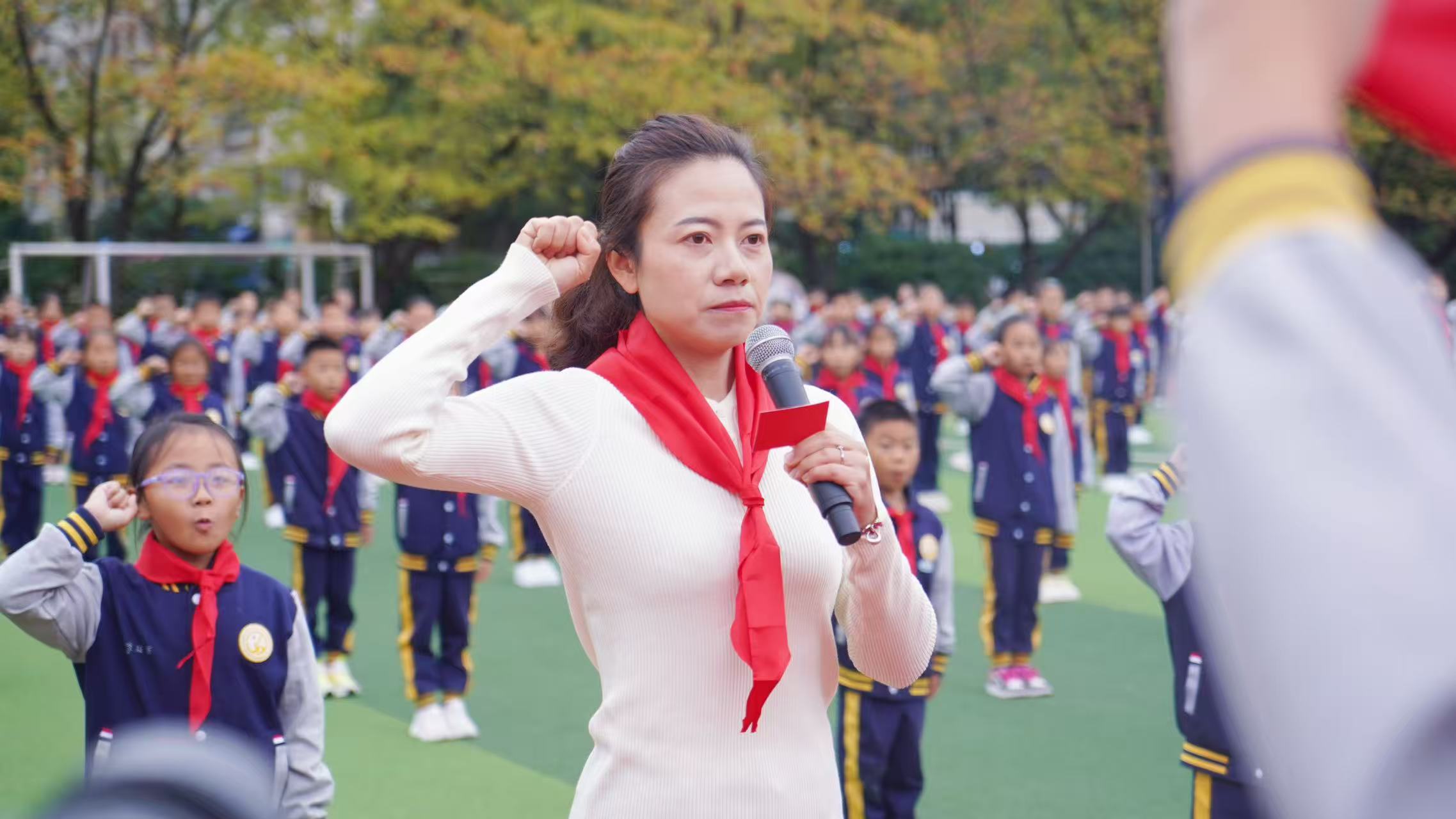 紧接着,在学校大队辅导员陈莹的带领下,全体右手握拳,举至肩上,庄严宣誓。铮铮誓言回荡在操场,诉说着新队员的坚定信念。少先队新队员代表分享成为少先队员的激动与自豪。