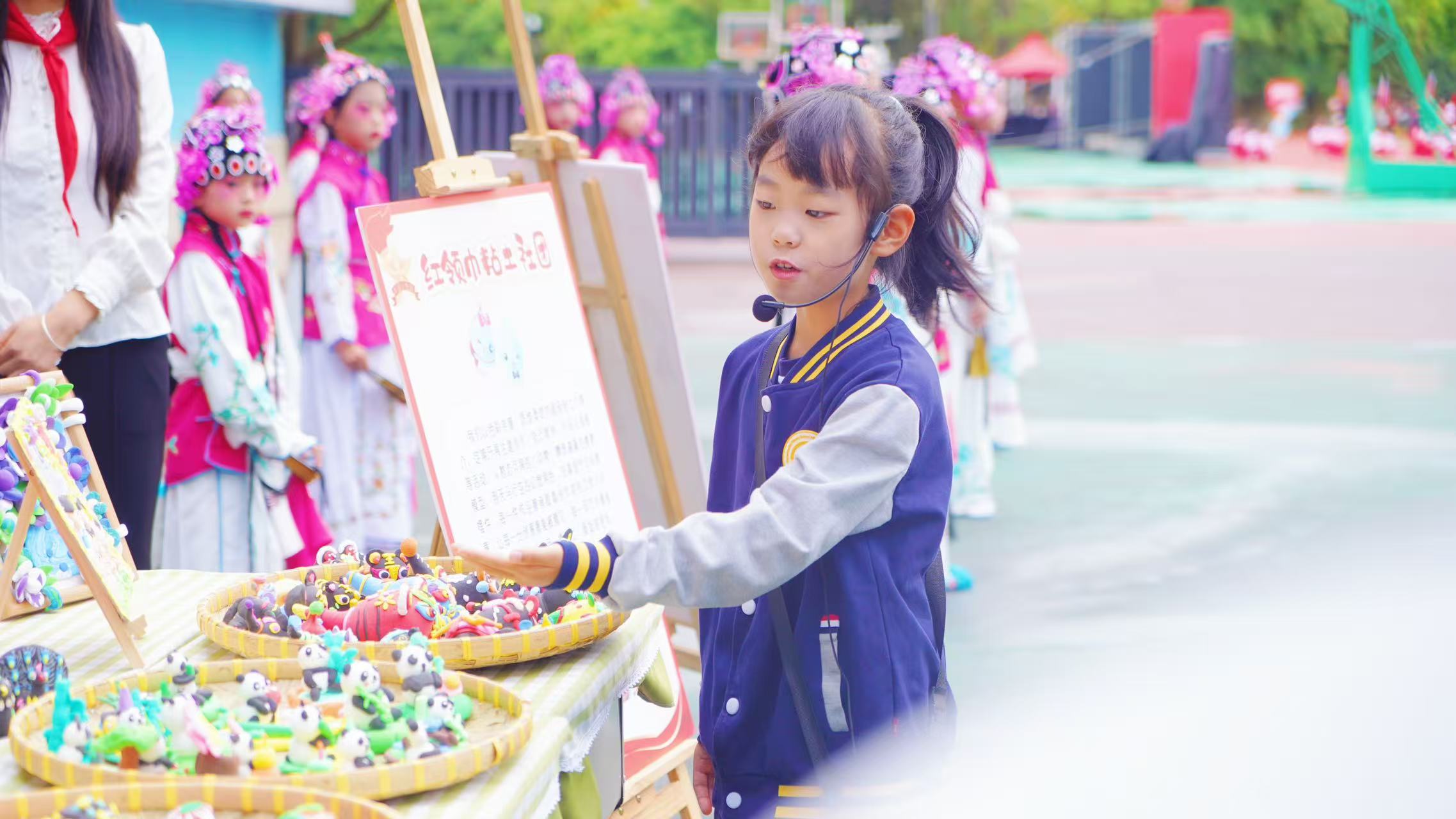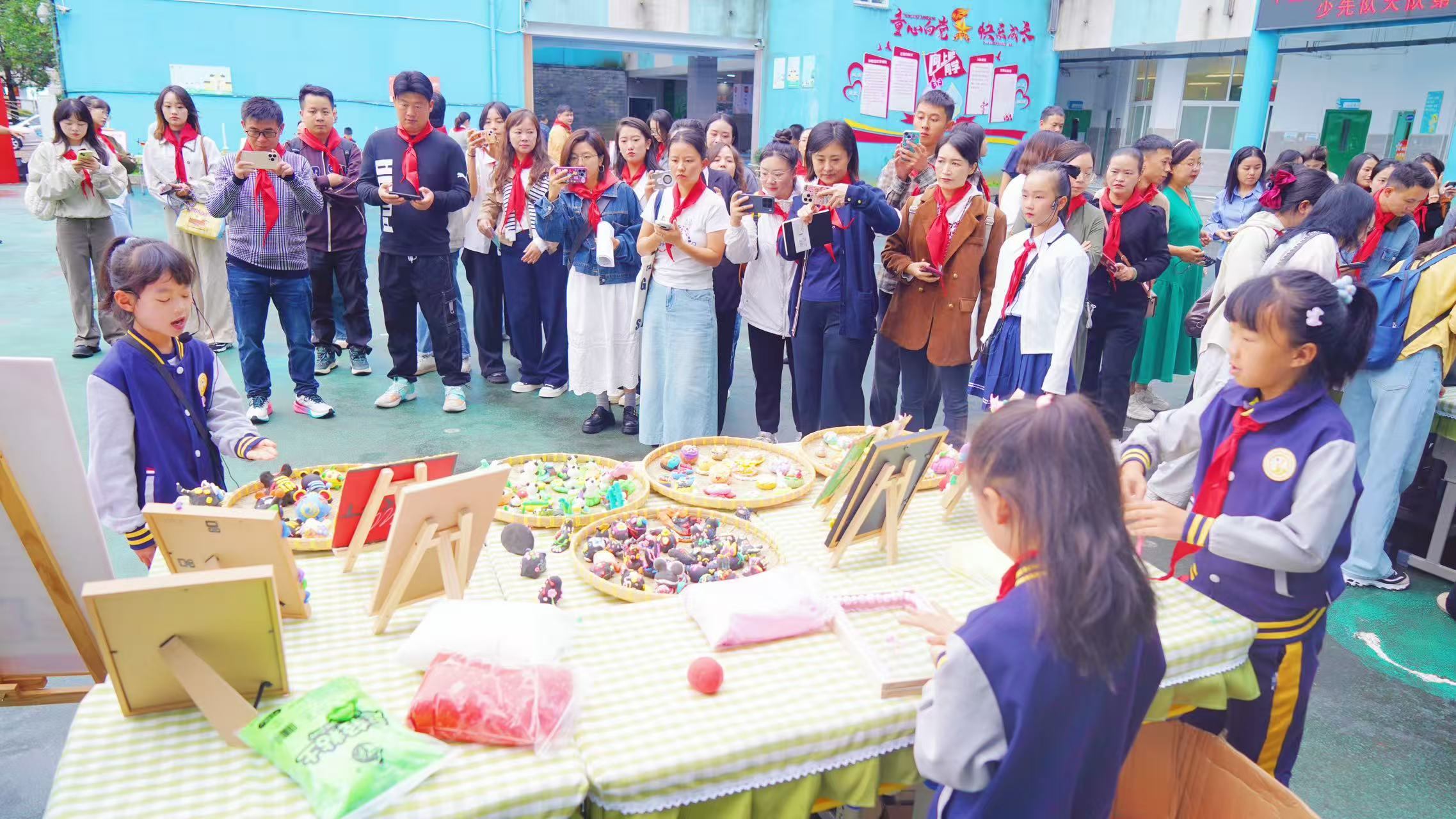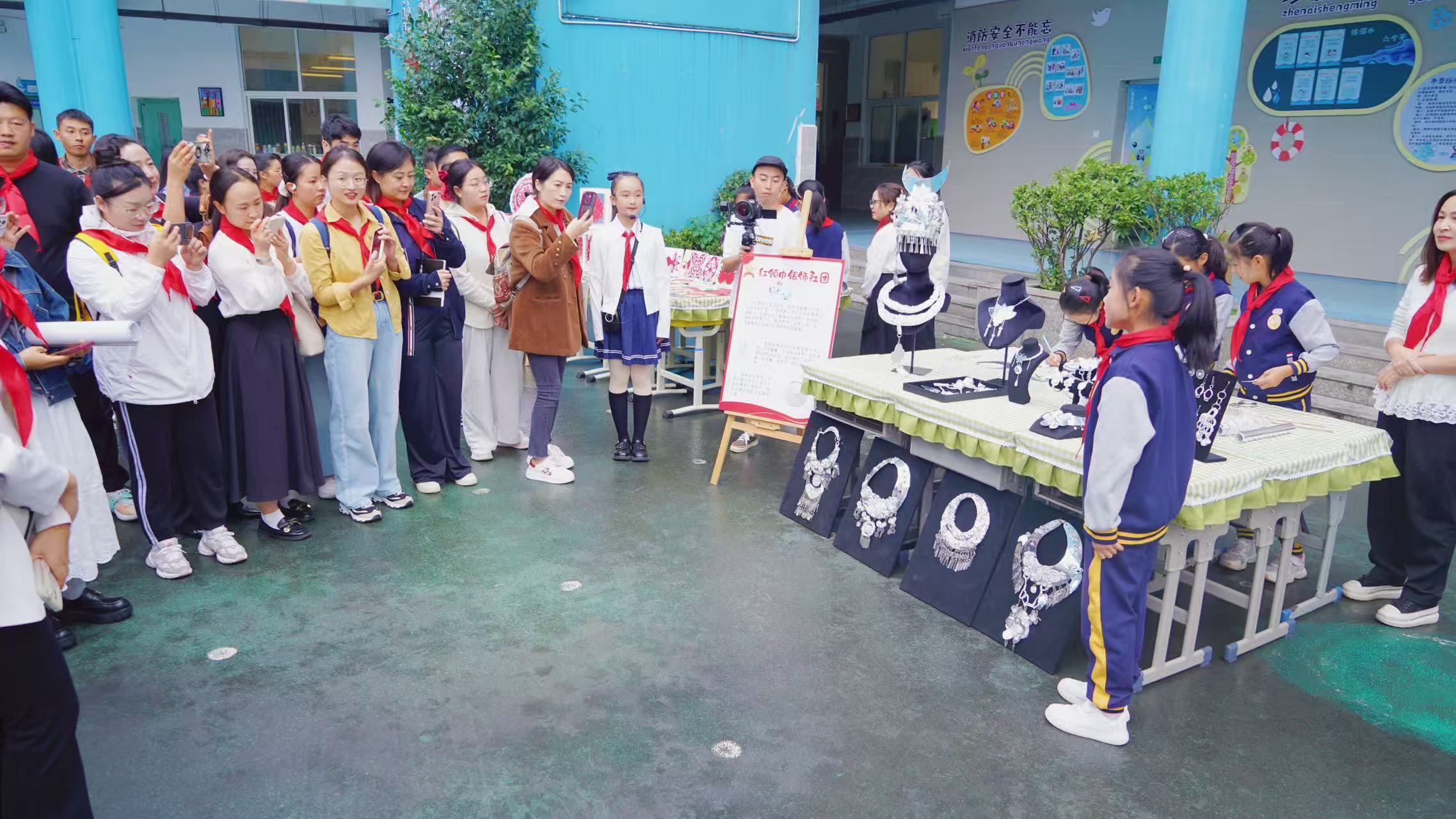 嘉宾们在少先队员礼仪队的引导下,参观了“红领巾”社团静态展示区。凌云航模社、方块梦想家、匠心银饰、纸韵社等社团通过作品陈列、现场演示讲解,充分展现了学校的育人特色。
