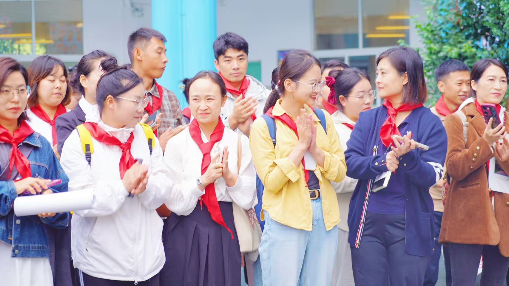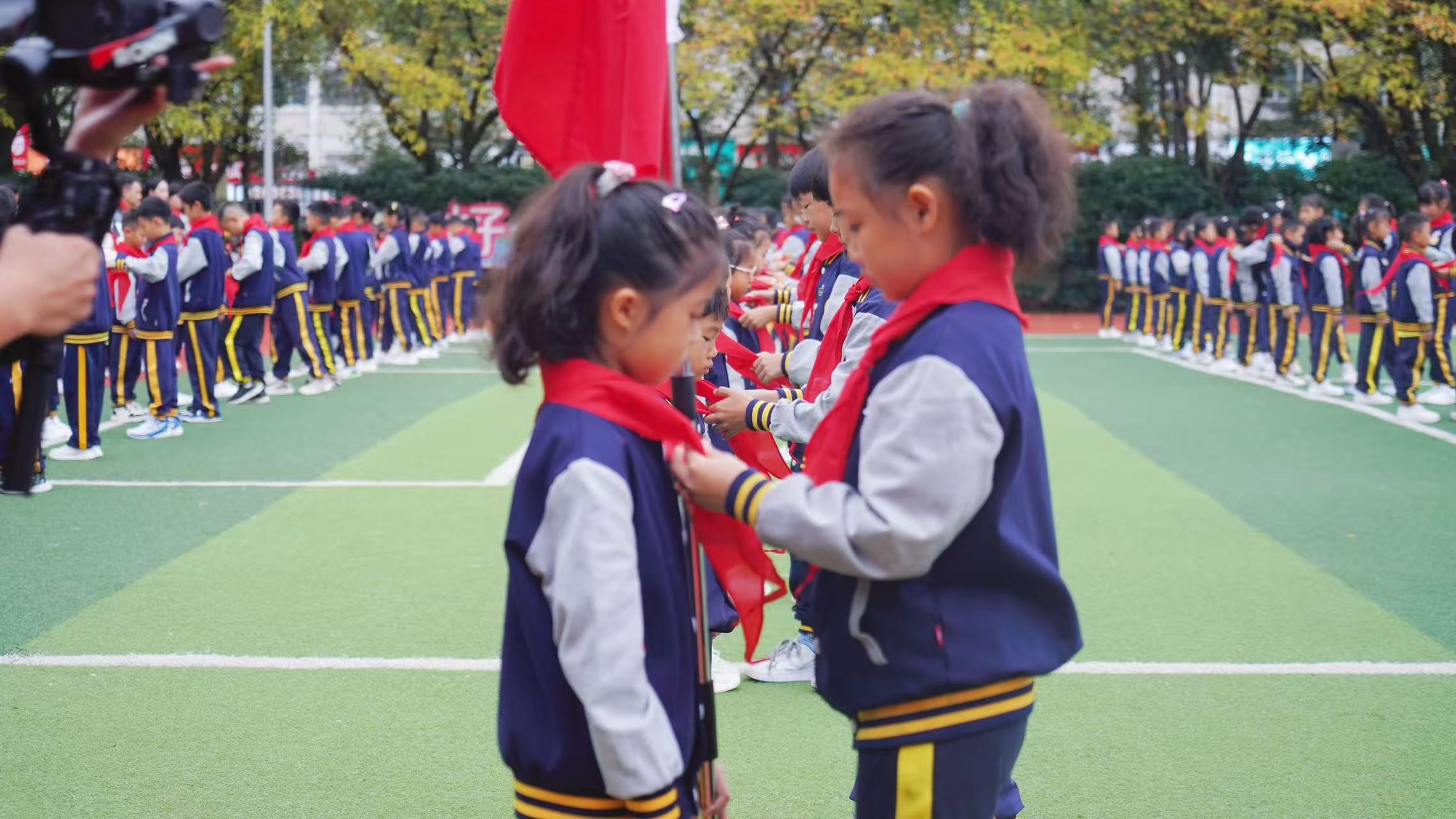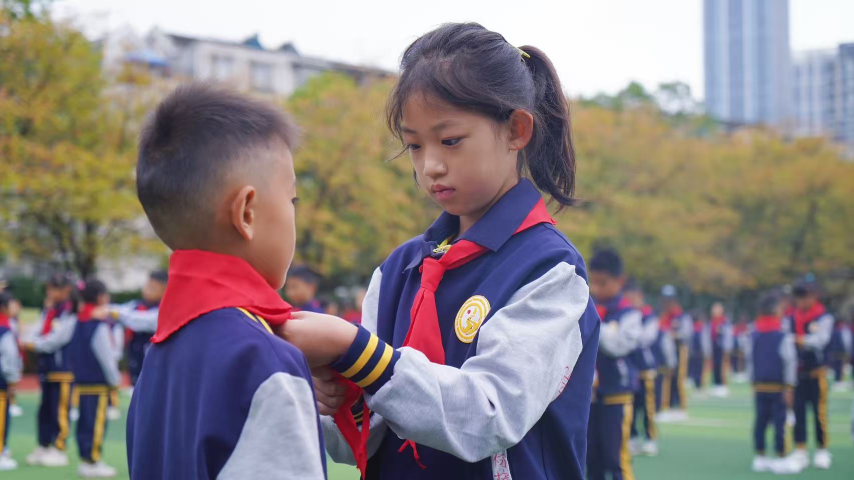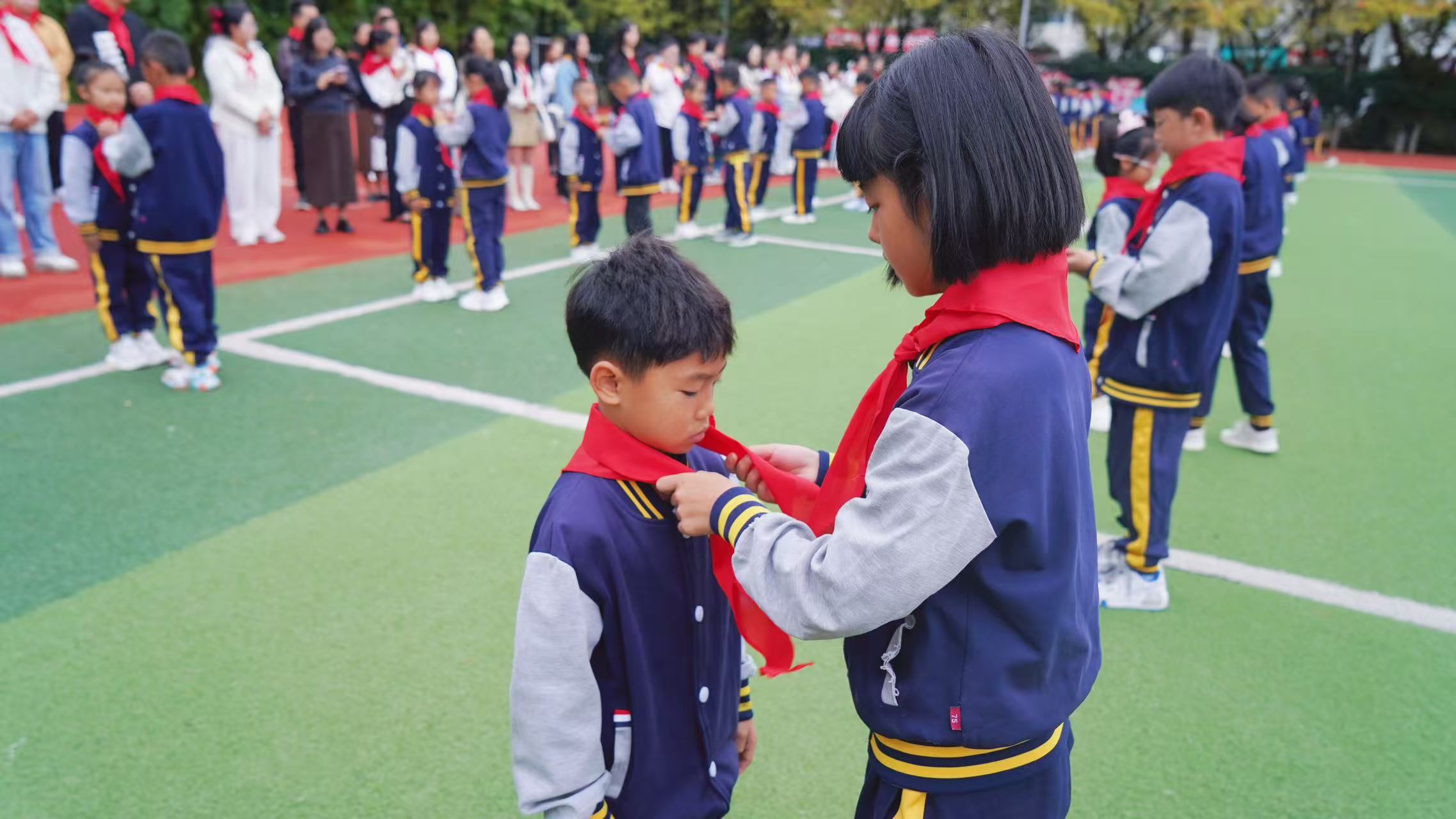 全体老队员有序为新队员授戴红领巾,新队员向老队员敬礼致谢,鲜红的红领巾在新队员胸前飘扬,象征着红色基因的传承。