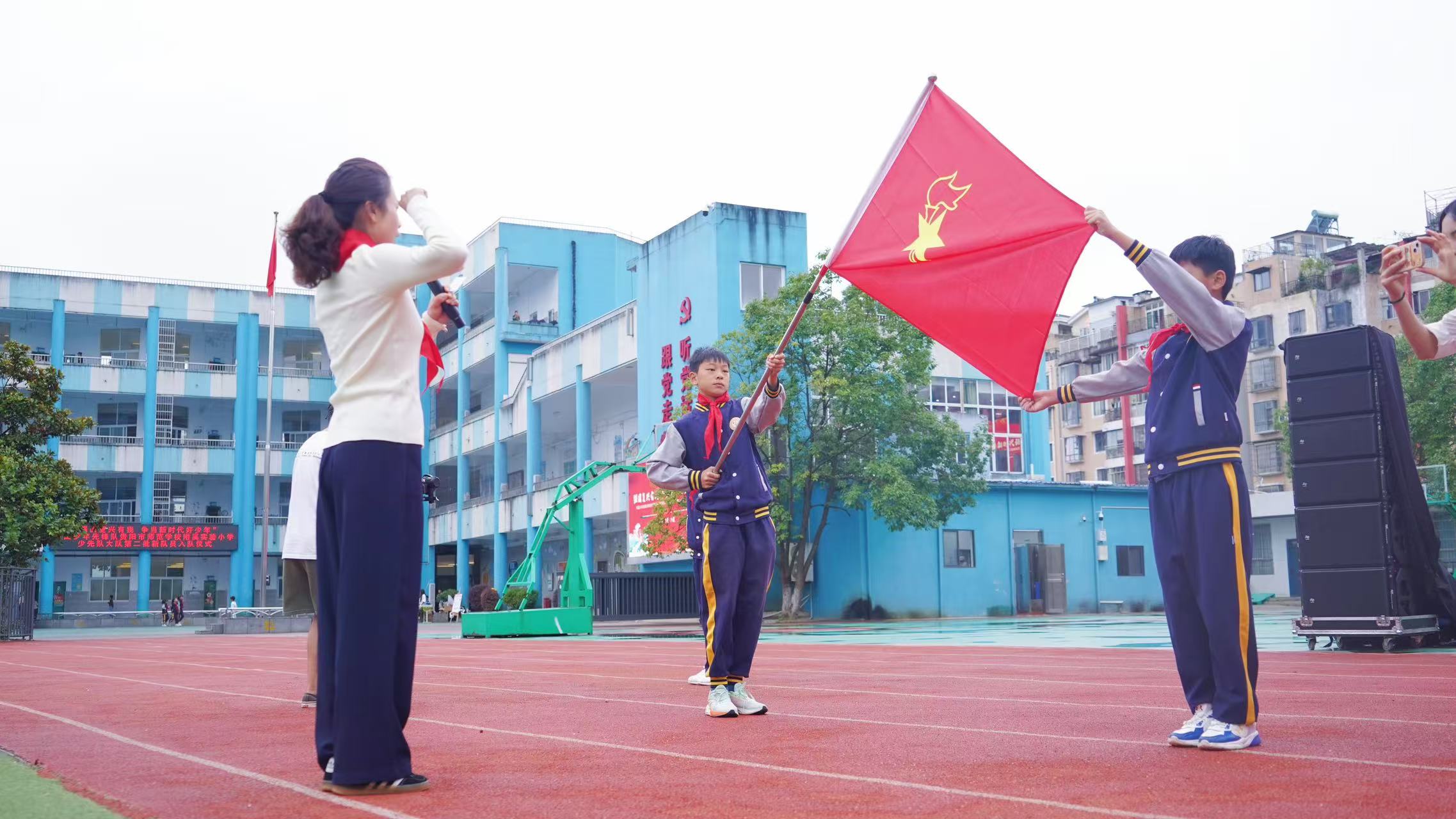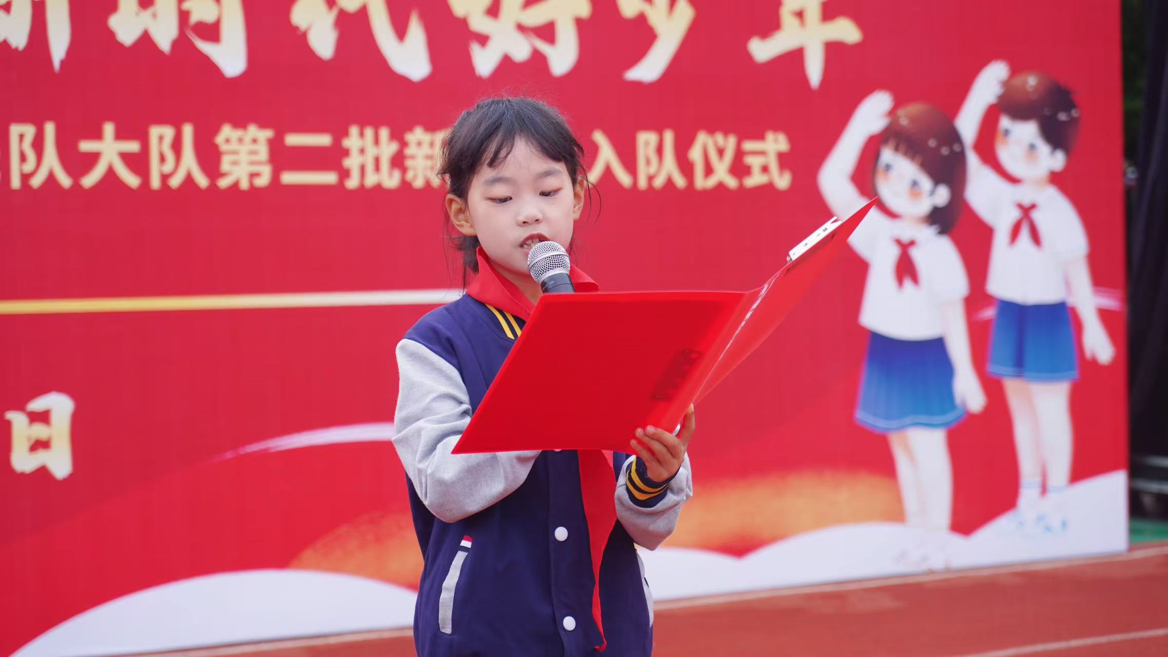 音乐响起,出中国少年先锋队队旗,全体齐唱中国少年先锋队队歌,歌声嘹亮,表达着心中加入中国少年先锋队的喜悦与向往。随后,大队组织委员郁睦妍以及少先队代表周芷玥宣读新队员名单。