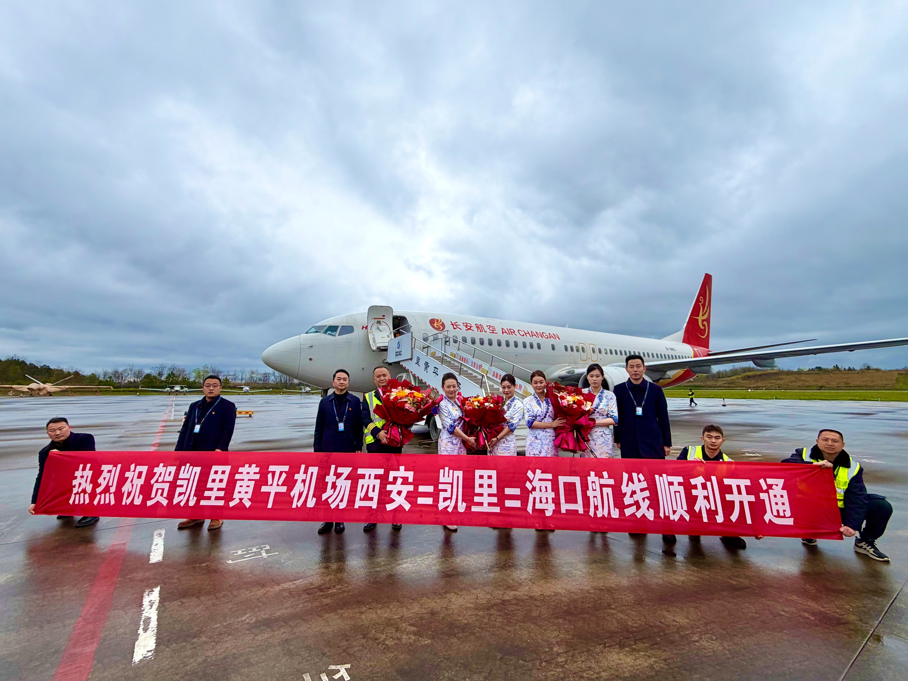 3月31日8时25分,长安航空一架B737-800型客机平稳降落在凯里黄平机场,西安=凯里=海口往返航线宣告正式通航,为黔东南空中交通网络建设再添全新助力,也让黔东南与西北、华南地区的空中联结更为紧密。