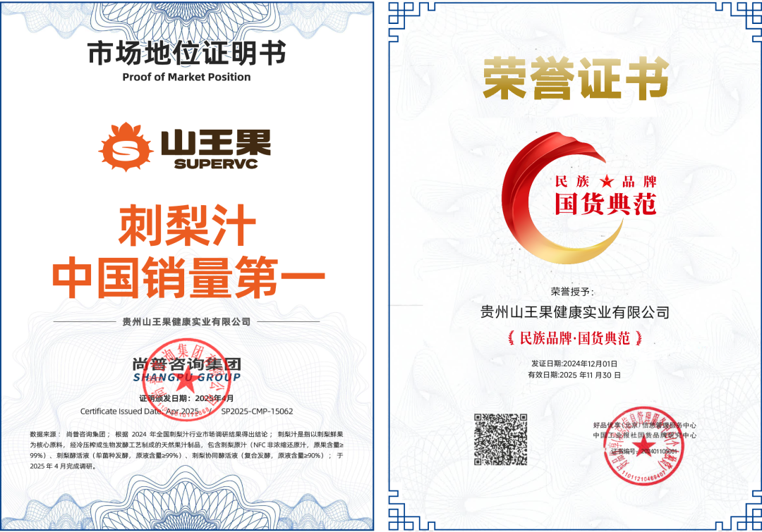 16年扎根贵州,如今,山王果不仅是中国刺梨汁销量第一的热门品牌,也是连续七年有机双认证、美国&欧盟有机产品认证的放心品牌,更斩获药食同源领域AAA信用企业、国际蒙特奖、iSEE创新品牌百强荣誉,成为名副其实的民族品牌、国货典范。