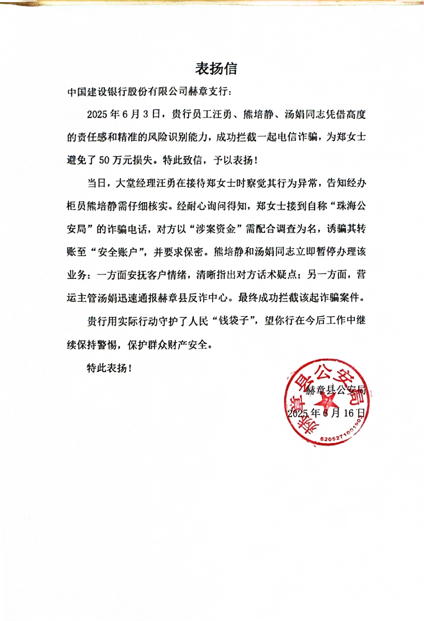 正是由于银行工作人员出色的风险防范意识和专业素养,及时指导客户操作避免了50万元的资金损失,有力地守护了群众的“钱袋子”,践行了金融为民的服务宗旨。
