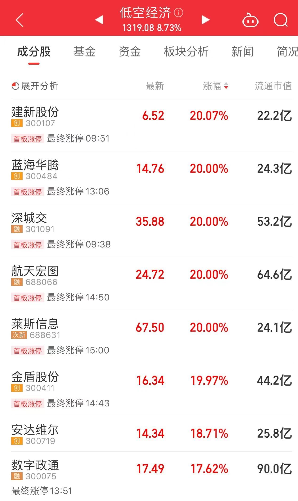 受政策利好推动,A股低空经济板块开盘见涨,午后进一步走高,尾盘虽稍有回落,但截至收盘,仍保持近9%的涨幅。同花顺概念板块中,低空经济、通用航空、飞行汽车等板块“起飞”,建新股份、蓝海华腾、深城交、航天宏图等“20CM”涨停,北纬科技、烽火电子等多股涨停。