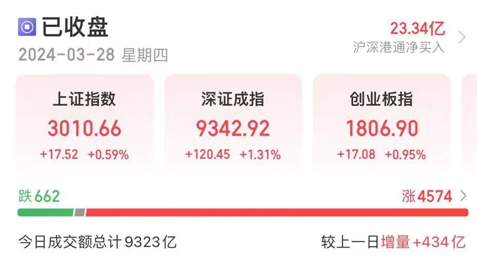 A股三大指数昨日(3.28)开盘后集体拉升,午后出现震荡调整,上证指数一度跌破3000点。临近尾盘,三大指数再度发力上扬,截至收盘,上证指数涨0.59%,深证成指涨1.31%,创业板指涨0.95%,两市超4500只个股上涨。