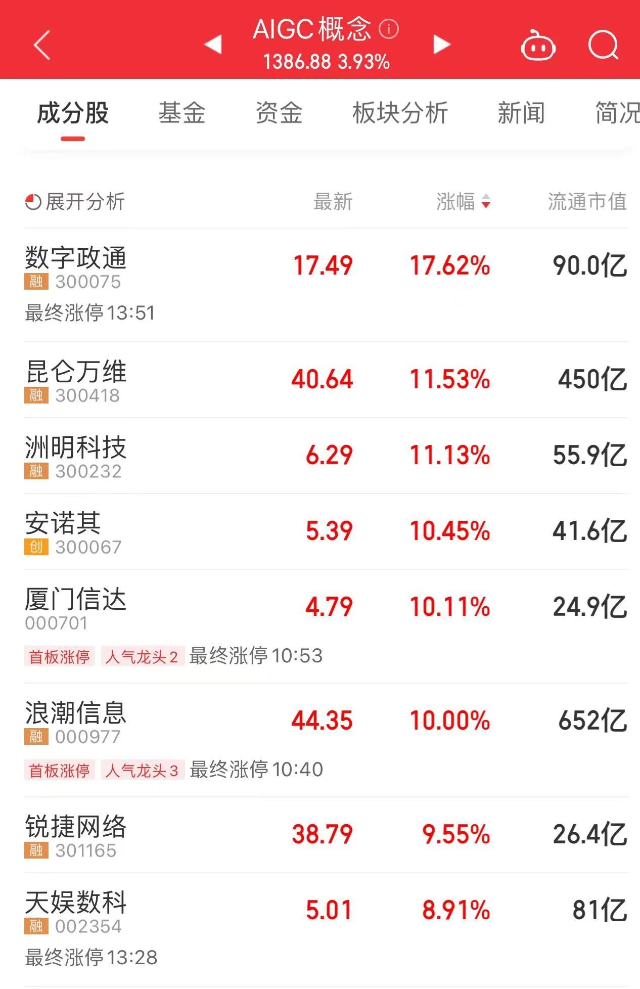 经历了前两日的调整,昨日AIGC、传媒板块涨势强劲。昆仑万维涨超11%,浪潮信息、厦门信达涨停,天娱数科等涨超8%,三六零、汉王科技、奥飞娱乐、中广天择等跟涨。