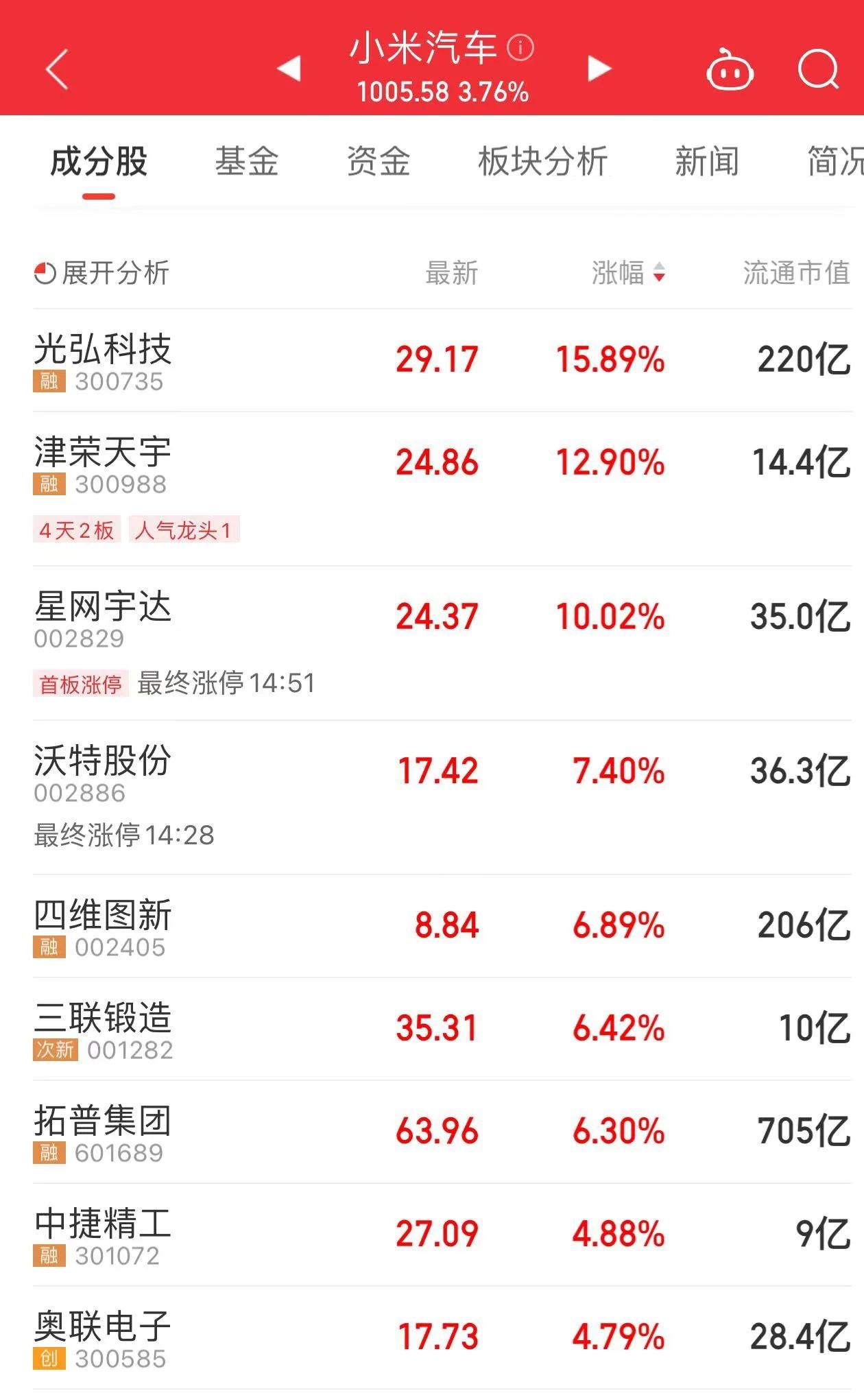 昨晚7点,小米汽车将举行SU7发布会,市场对小米相关概念也充满期待。截至收盘,光弘科技涨近16%,津荣天宇涨近13%,星网宇达涨停。