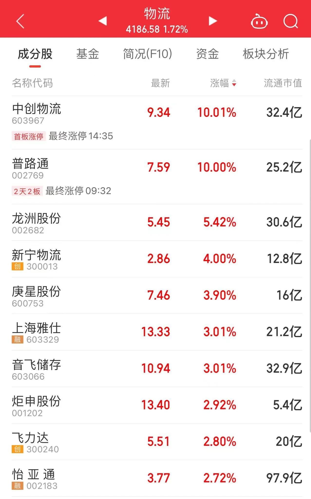 物流板块全天稳步走强。普路通开盘迅速涨停、中创物流午后直线拉升至涨停,龙洲股份、新宁物流等跟涨。消息面上,据珠海市快递行业协会消息,珠海、深圳间首条无人机低空快递物流航路近日启动试运行,目前计划用于医院紧急药械、应急救护投递领域。