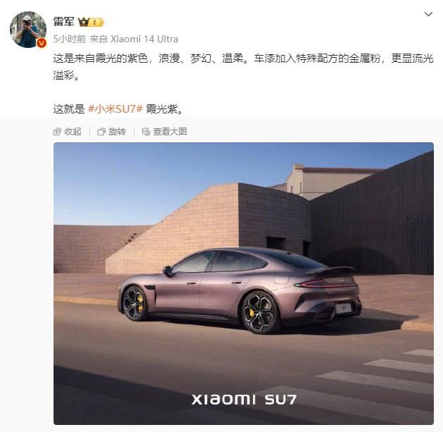 小米集团董事长兼CEO雷军已连续多日在微博上为该场发布会预热。今日午间,雷军发微博称:“好久没有这么兴奋、这么紧张了。”此外,他还在微博上展示了小米SU7的霞光紫配色车型。
