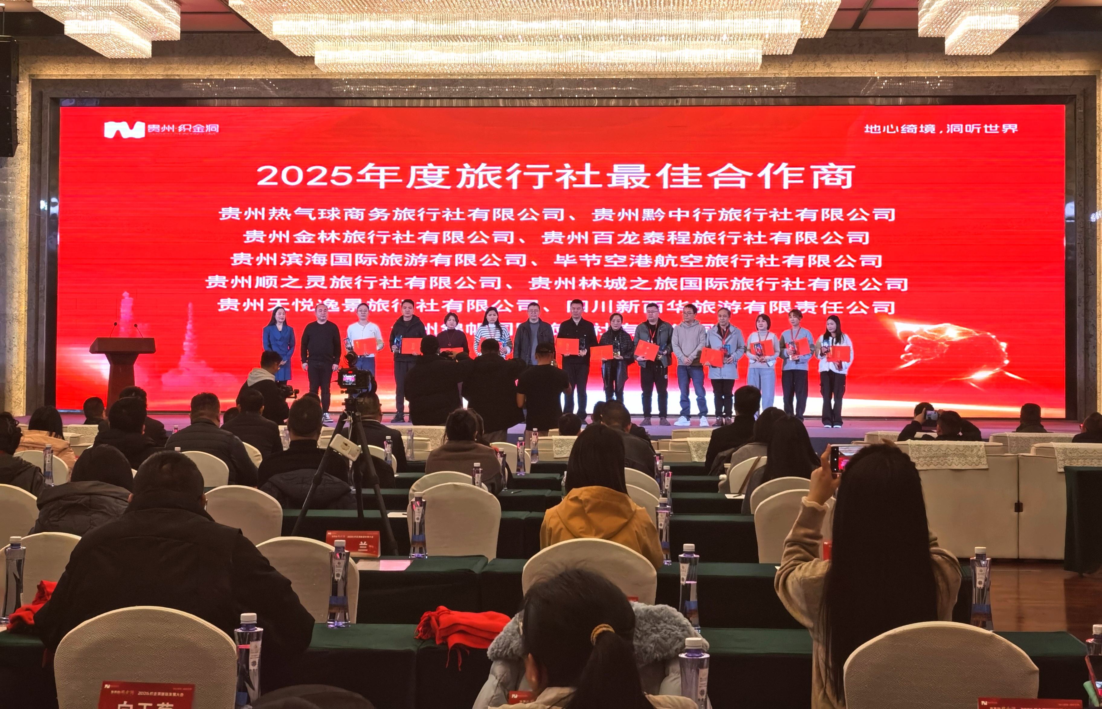 同时,会上还对2025年度优秀旅行社、OTA平台、媒体单位及合作单位颁奖。此外,大会还设置了资源推介环节,九洞天等织金县优质文旅资源得到专题介绍,未来将通过产品整合、路线串联、交通配套优化,构建全域旅游新格局。